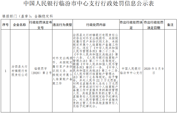 上述行为违反了《中华人民共和国人民币管理条例》第二十二条、《中华人民共和国反洗钱法》第十六条、《人民币银行结算账户管理办法》第二十八条等规定。根据《中华人民共和国人民币管理条例》第四十一条、《中华人民共和国反洗钱法》第三十二条、《人民币银行结算账户管理办法》第六十七条等规定,中国人民银行临汾市中心支行对其给予警告,并处人民币22.7万元罚款,对两名直接负责人各处1万元罚款。并责成该行对个人结算账户备案工作中直接负责的高级管理人员、其他直接负责的主管人员、直接责任人员按规定给予纪律处分,对人民币管理工作中直接负责的主管人员和其他直接责任人员给予纪律处分。