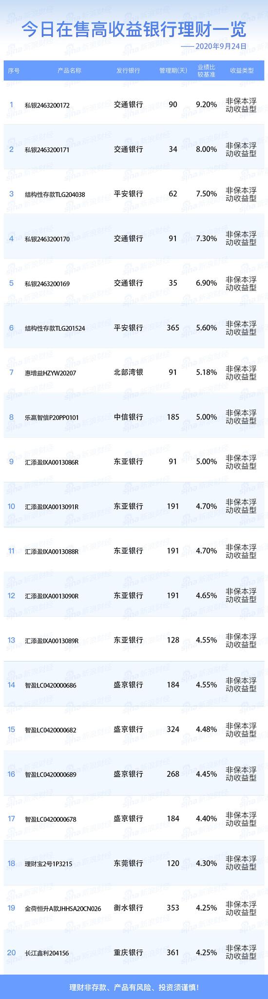 银行9月24日在售高收益理财产品