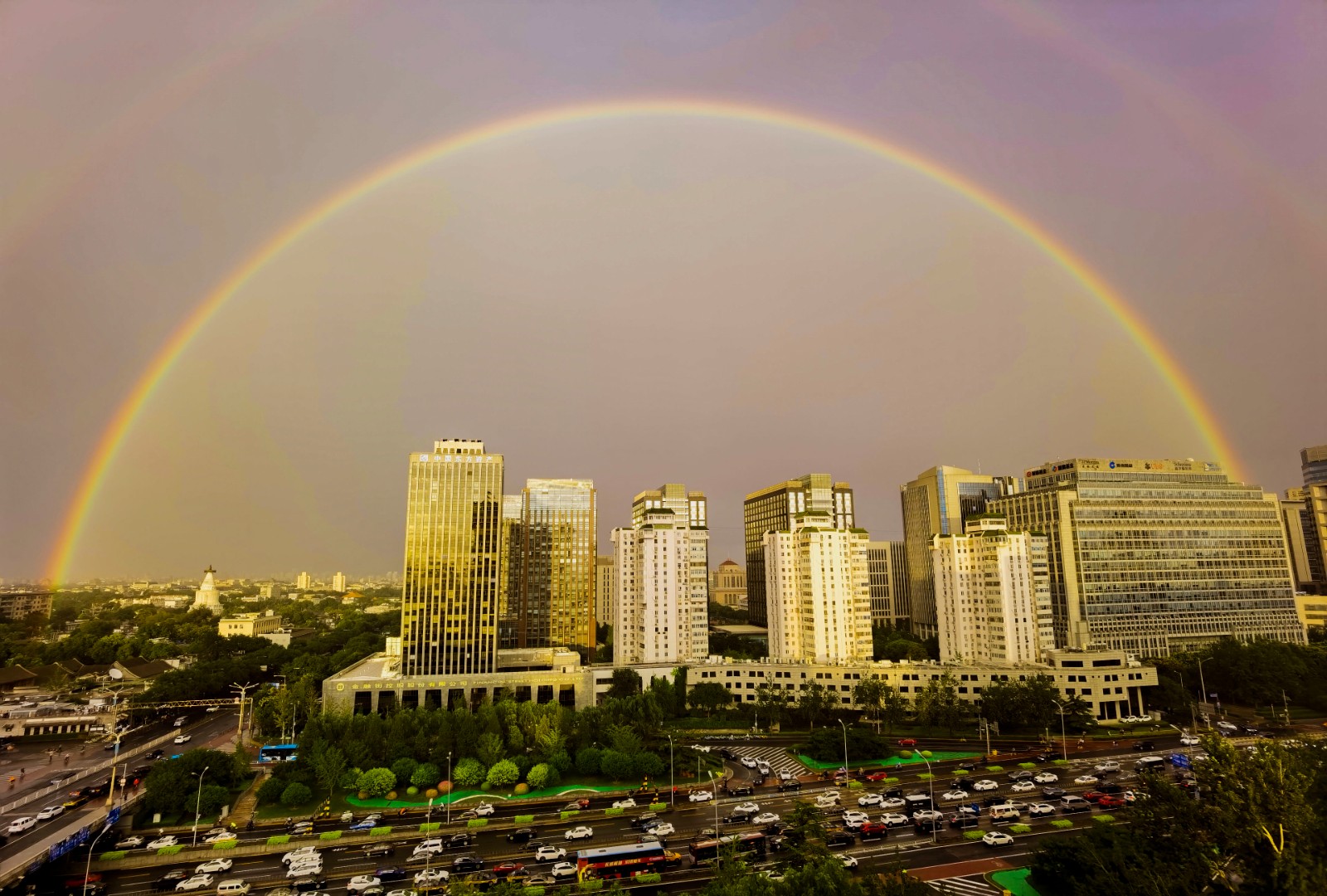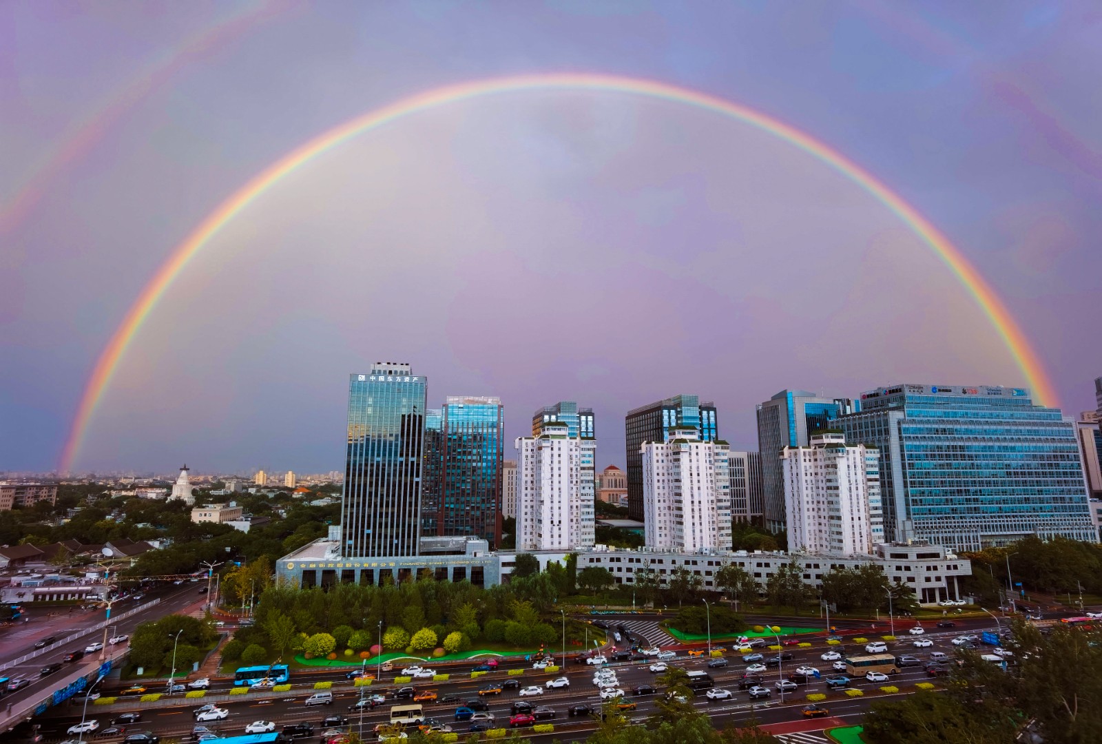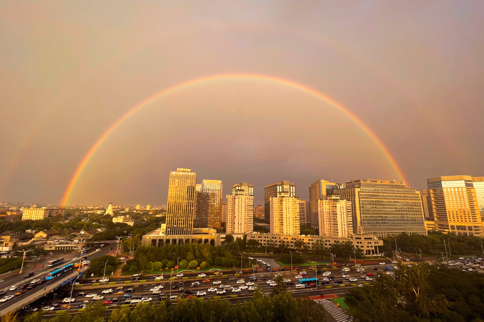 2021年8月26日下午18时,雨后的北京出现超级彩虹,多个地方出现了惊人的景象。这是微摄摄影师从西城区阜成门万通金融中心拍摄到的超级双彩虹。彩虹将北京金融街照耀成金色的世界,持续了一个小时,场面十分壮观。