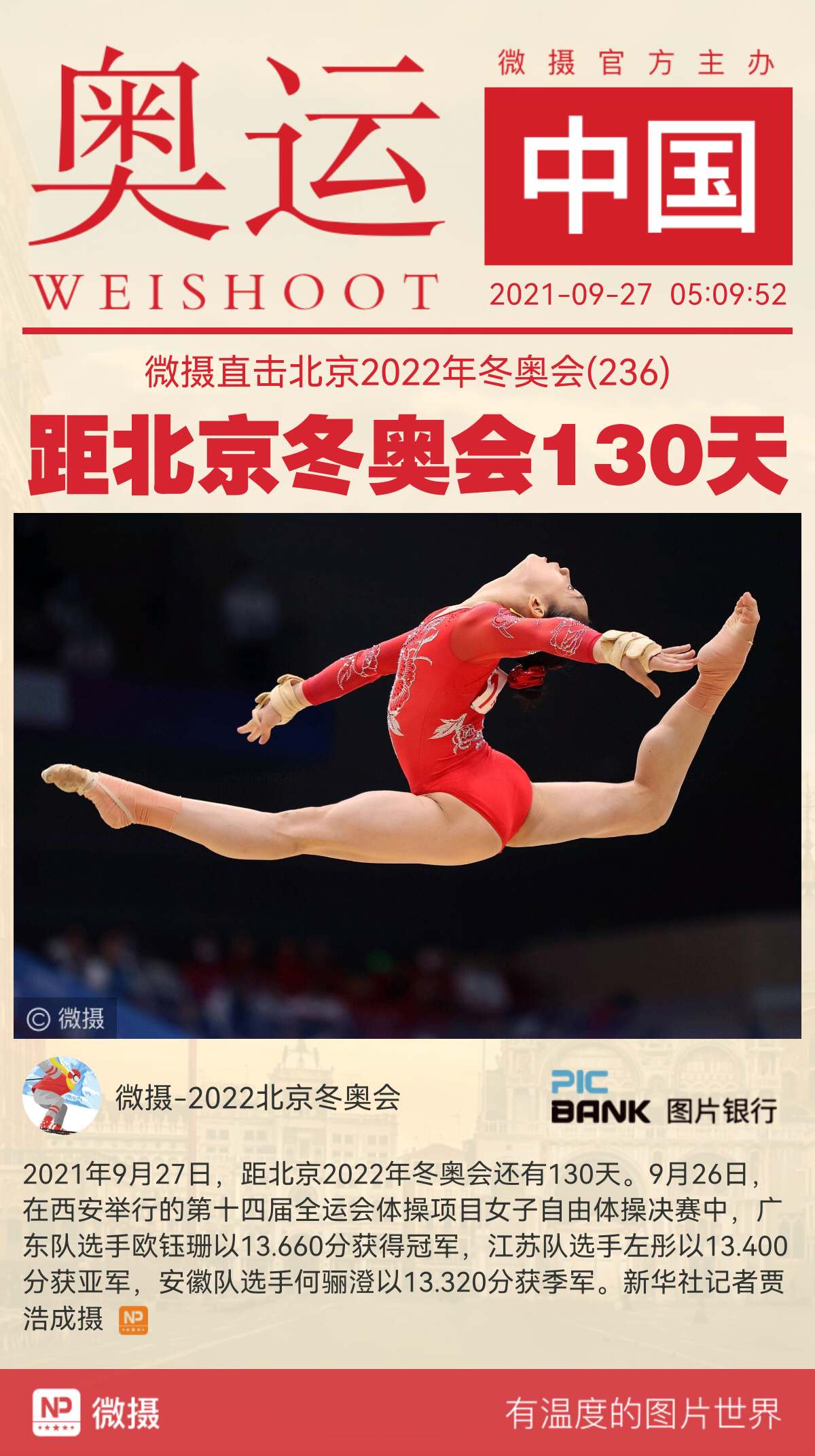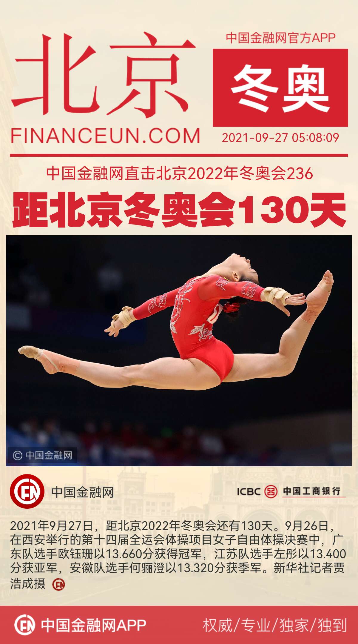 2021年9月27日,距北京2022年冬奥会还有130天。9月26日,在西安举行的第十四届全运会体操项目女子自由体操决赛中,广东队选手欧钰珊以13.660分获得冠军,江苏队选手左彤以13.400分获亚军,安徽队选手何骊澄以13.320分获季军。