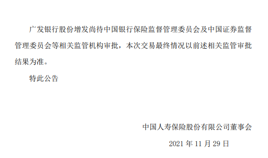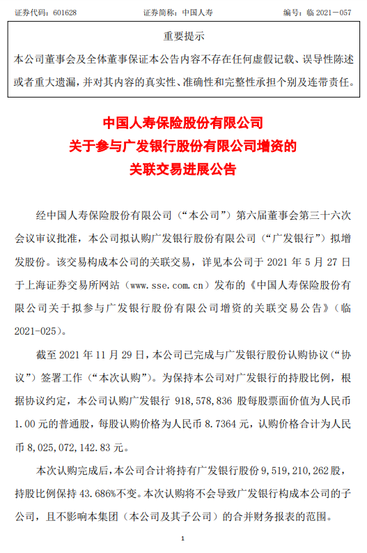 •   11月29日消息,中国人寿发布公告,截至2021年11月29日,公司已完成与广发银行股份认购协议签署工作。为保持公司对广发银行的持股比例,根据协议约定,公司认购广发银行9.19亿股每股票面价值为人民币1.00元的普通股,每股认购价格为人民币8.7364元,认购价格合计为人民币80.25亿元。