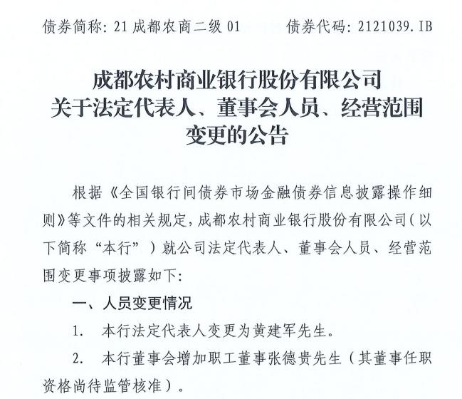 •   3月17日,中国货币网发布《成都农村商业银行关于法定代表人、董事会人员、经营范围变更的公告》,公告显示该行法定代表人变更为黄建军,董事会增加职工董事张德贵,张德贵董事任职资格尚待监管核准。