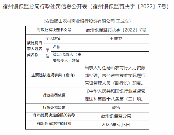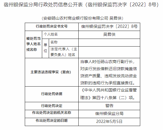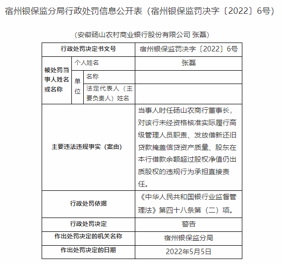 含山农商行违法发放借名贷款遭罚
