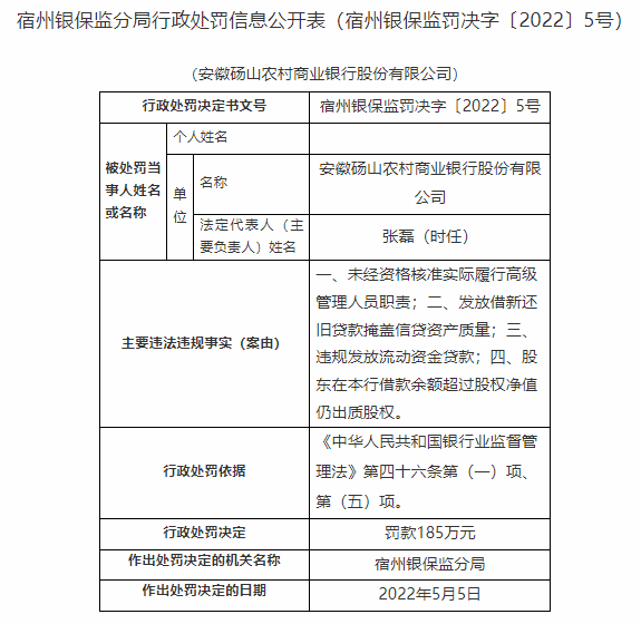 安徽灵璧农商行3宗违法遭央行处罚