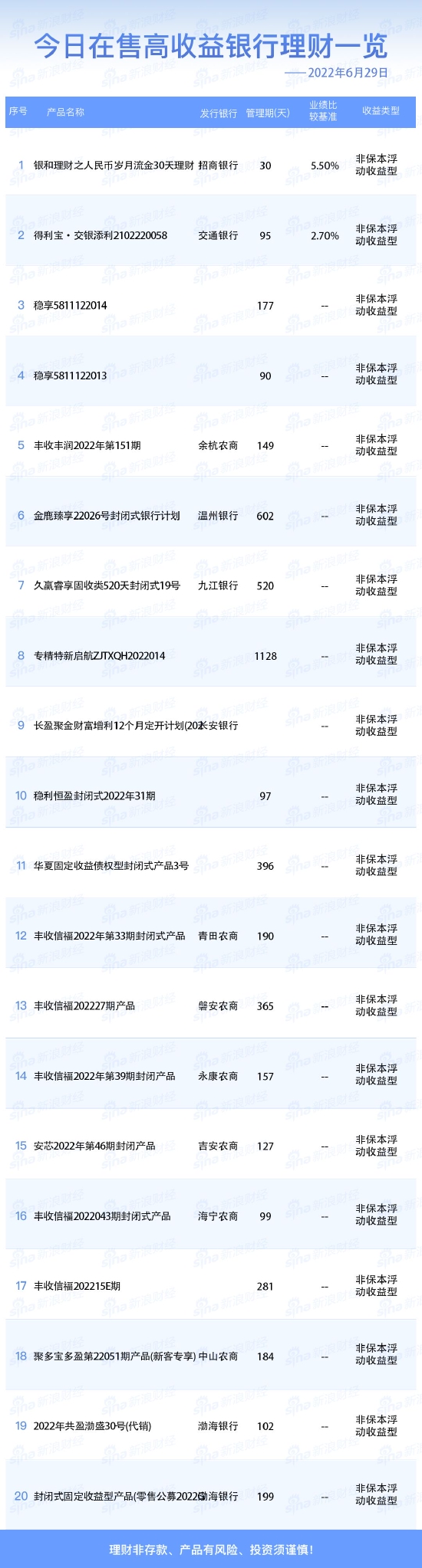 •   新浪财经6月29日在售高收益银行理财产品一览。今日业绩比较基准在2.70%及以上的银行人民币理财产品共2款。理财非存款、产品有风险、投资须谨慎!
