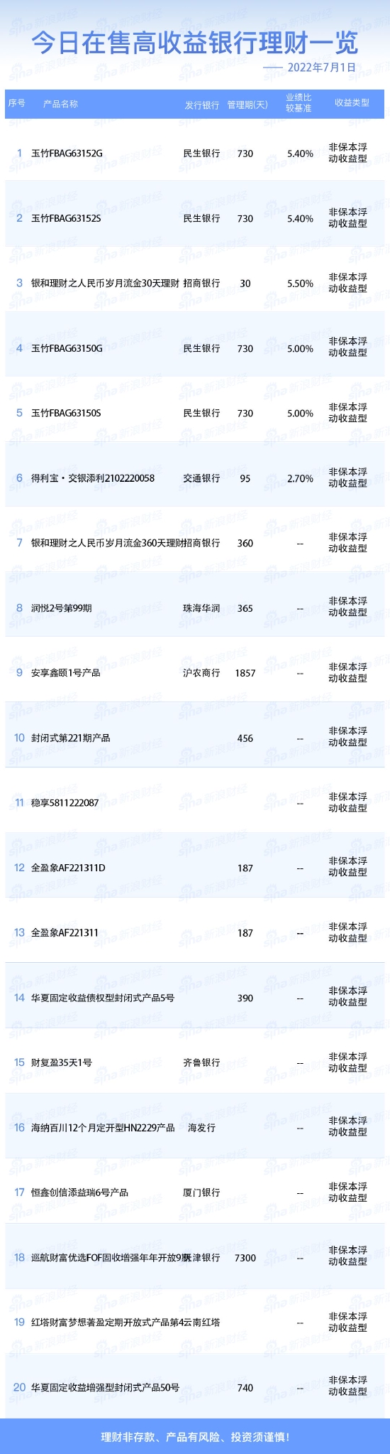•   7月1日在售高收益银行理财产品一览。今日业绩比较基准在2.70%及以上的银行人民币理财产品共6款。理财非存款、产品有风险、投资须谨慎!