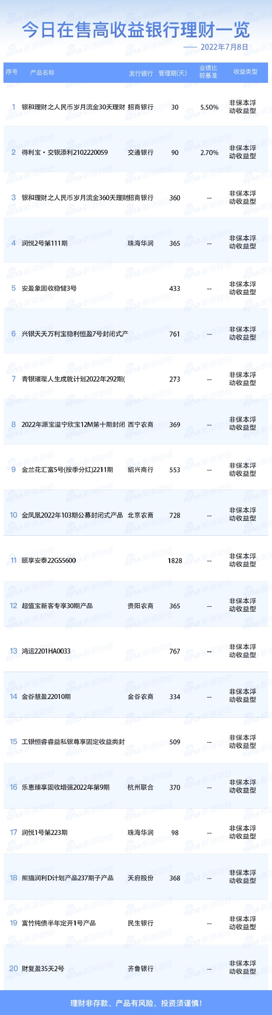•   新浪财经7月8日在售高收益银行理财产品一览。今日业绩比较基准在2.70%及以上的银行人民币理财产品共2款。理财非存款、产品有风险、投资须谨慎!