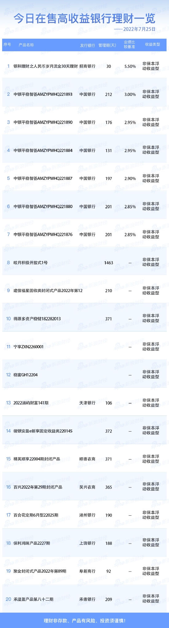 •   新浪财经7月25日在售高收益银行理财产品一览。今日业绩比较基准在2.85%及以上的银行人民币理财产品共7款。理财非存款、产品有风险、投资须谨慎!