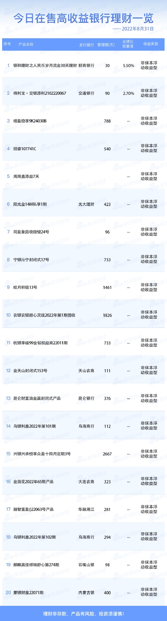•   新浪财经8月31日在售高收益银行理财产品一览。今日业绩比较基准在2.70%及以上的银行人民币理财产品共2款。理财非存款、产品有风险、投资须谨慎!