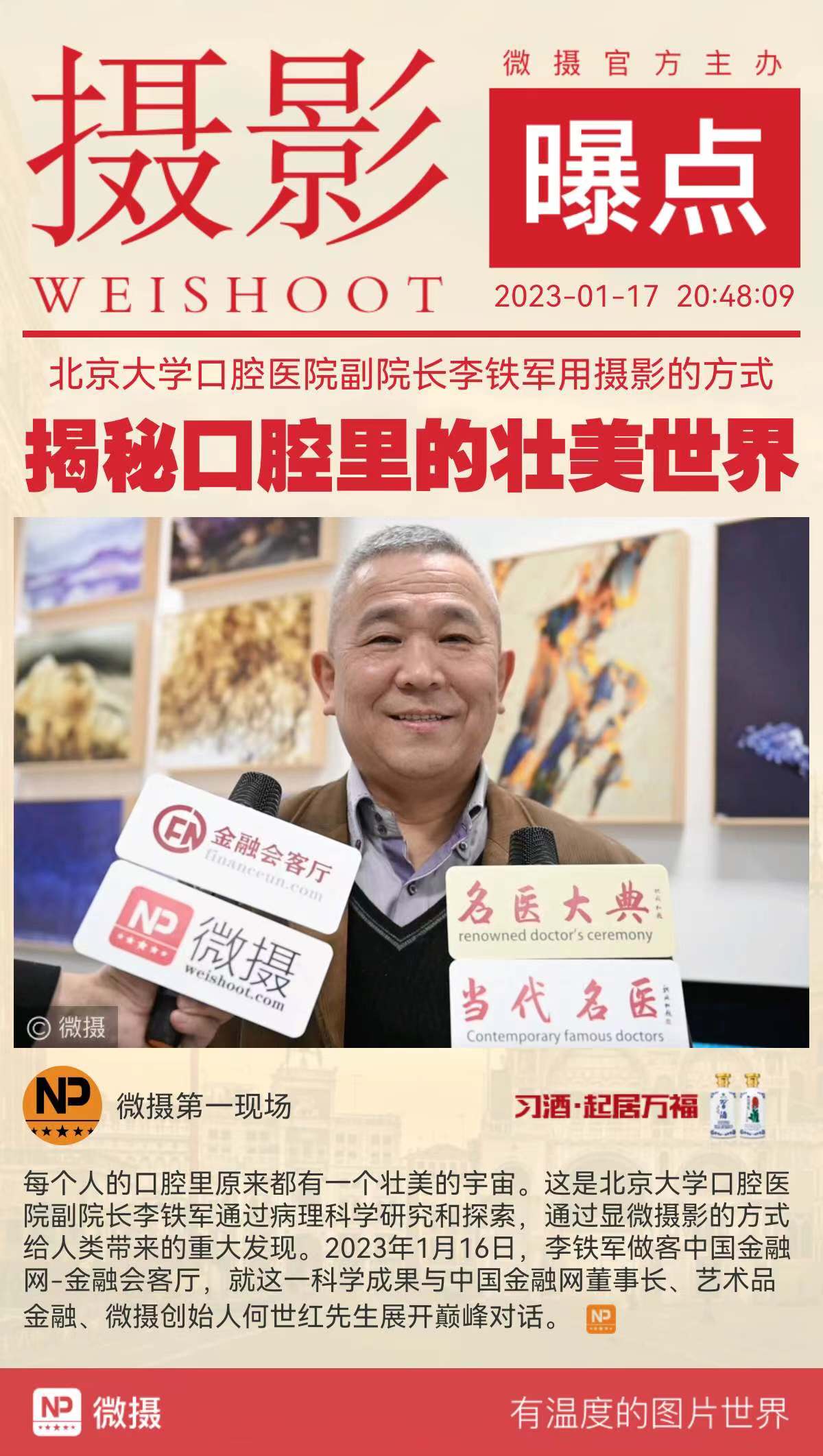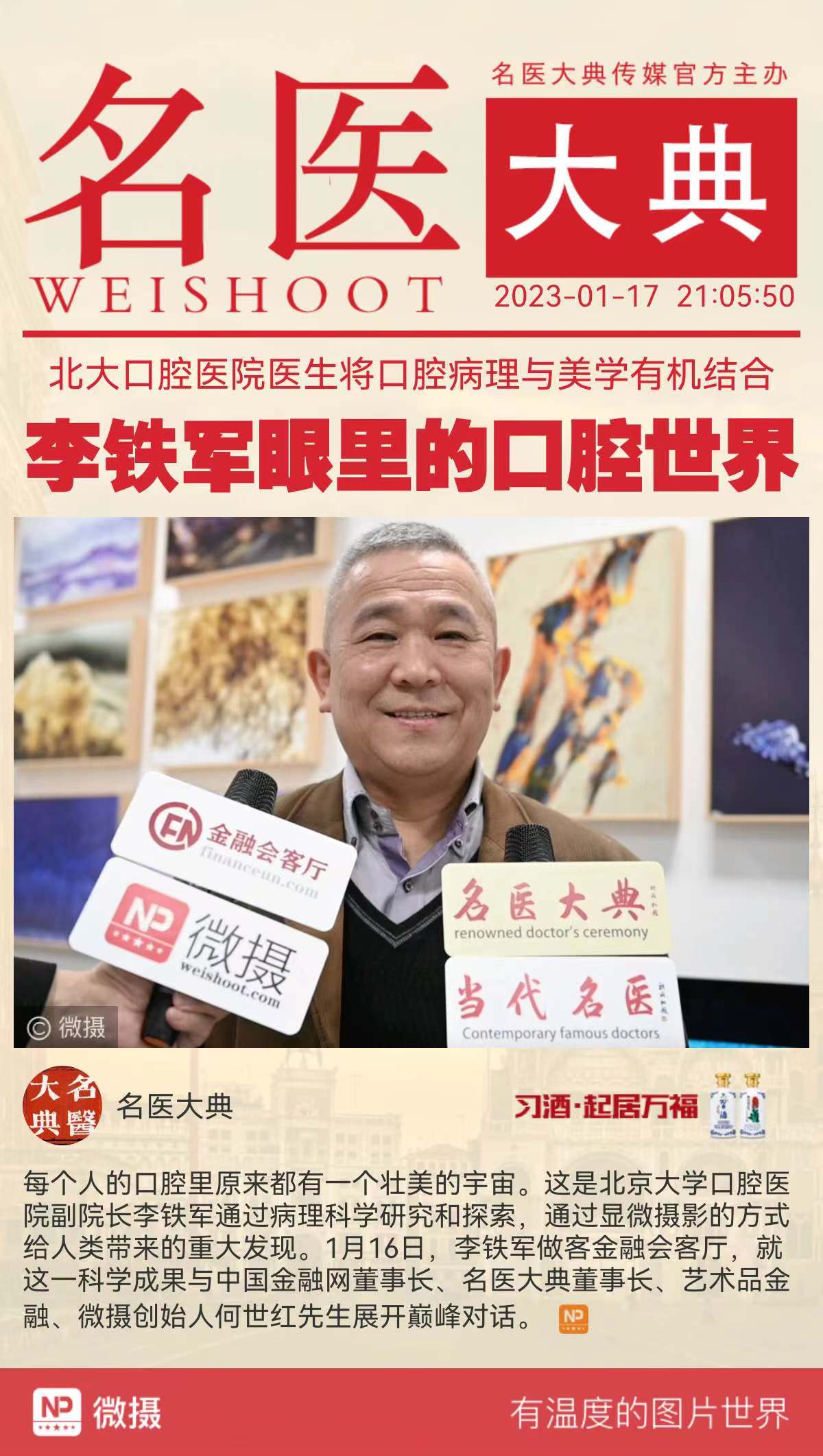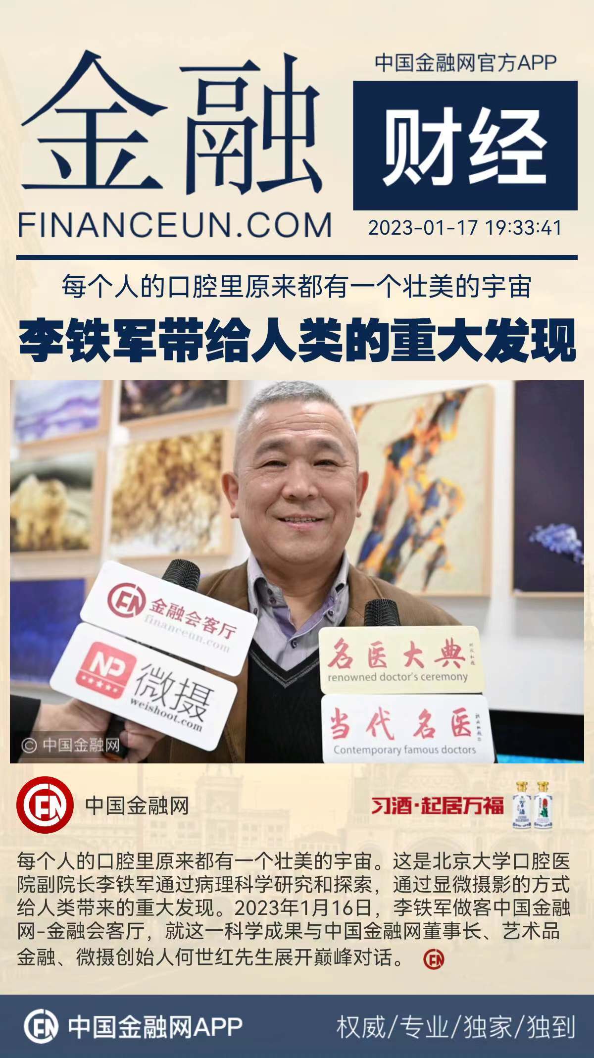 每个人的口腔里原来都有一个壮美的宇宙。这是北京大学口腔医院副院长李铁军通过病理科学研究和探索,通过显微摄影的方式给人类带来的重大发现。2023年1月16日,李铁军做客中国金融网-金融会客厅,就这一科学成果与中国金融网董事长、名医大典董事长、艺术品金融、微摄创始人何世红先生展开巅峰对话。