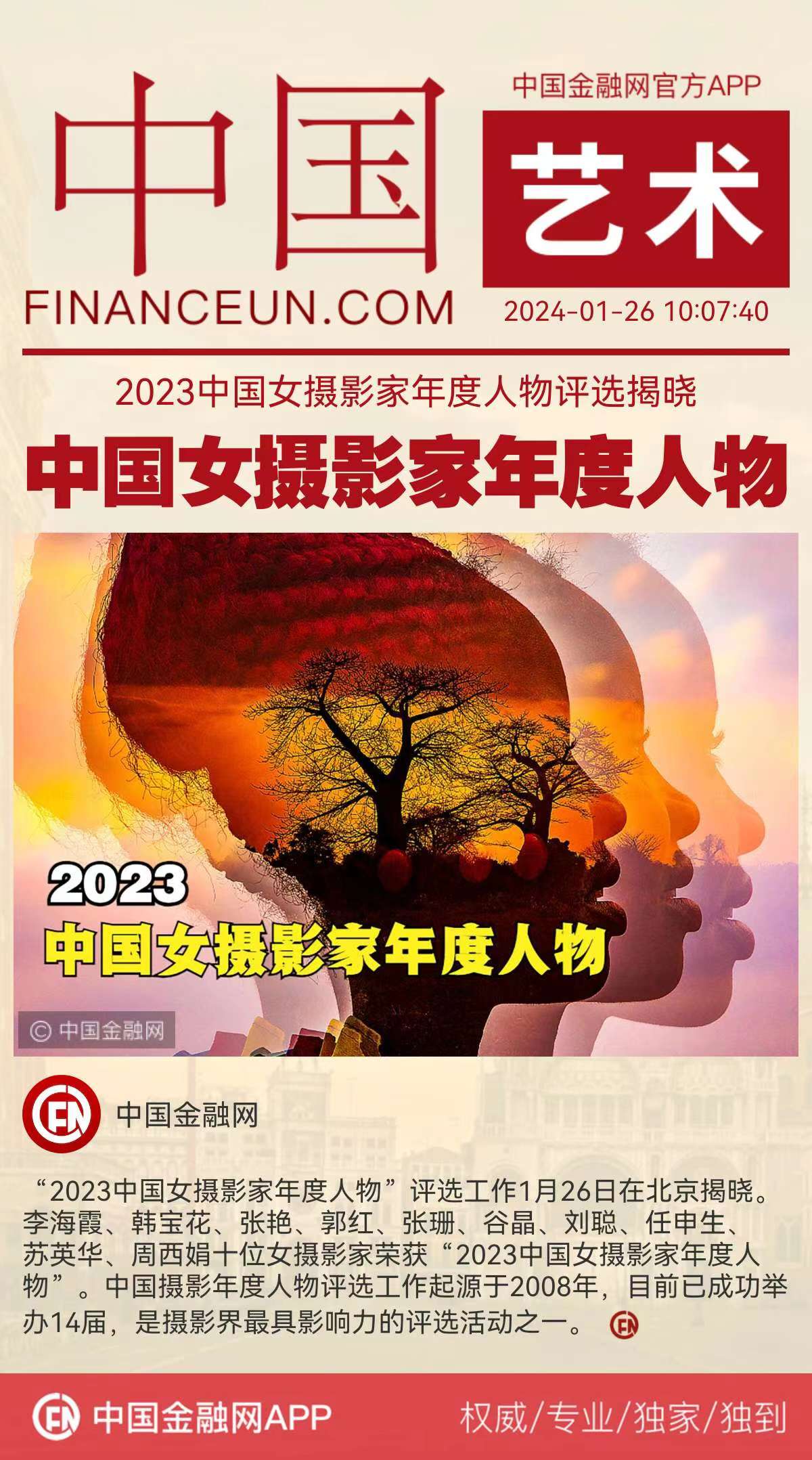 以“致敬摄影精神”为主题的“2023中国女摄影家年度人物”评选工作2024年1月26日在北京揭晓。李海霞、韩宝花、张艳、郭红、张珊、谷晶、刘聪、任申生、苏英华、周西娟十位女摄影家荣获“2023中国女摄影家年度人物”。