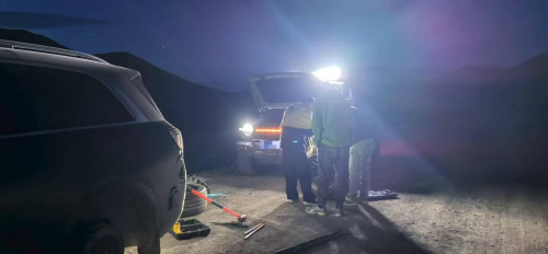 抵达现场后,面对高海拔缺氧和恶劣气候等严苛条件,救援人员立即启动紧急补胎措施。经过8小时奋战,救援队成功修复了故障轮胎,并将车主及其同行亲友安全护送至附近酒店。